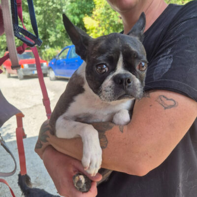 Venus ist ein Boston Terrier von einem italienischen Züchter. Er hat dann auf eine andere Rasse umgeschwenkt und zum Glück die Einsicht gehabt, Venus die Möglichkeit zu geben, adoptiert zu werden und nicht als Vermehrerin zu enden.